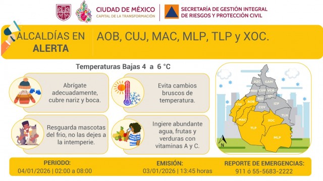CIUDAD DE MÈXICO 03 DE ENERO (CDMX MAGACIN).-La Secretaría de Gestión Integral de Riesgos y Protección Civil, informò que se activò la Alerta Amarilla por pronóstico de temperaturas bajas para las primeras horas de mañana en las Alcaldías: Álvaro Obregón, Cuajimalpa, Magdalena Contreras, Milpa Alta, Tlalpan y Xochimilco.