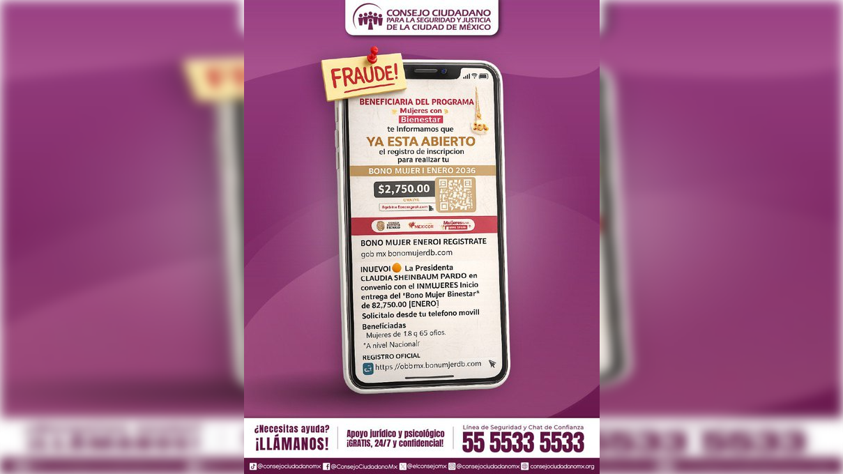 CIUDAD DE MÈXICO 15 DE ENERO (CDMX MAGACIN).- El Consejo Ciudadano informo acerca de la alerta debido a al fraude como “Bono Mujer Bienestar 2026”.