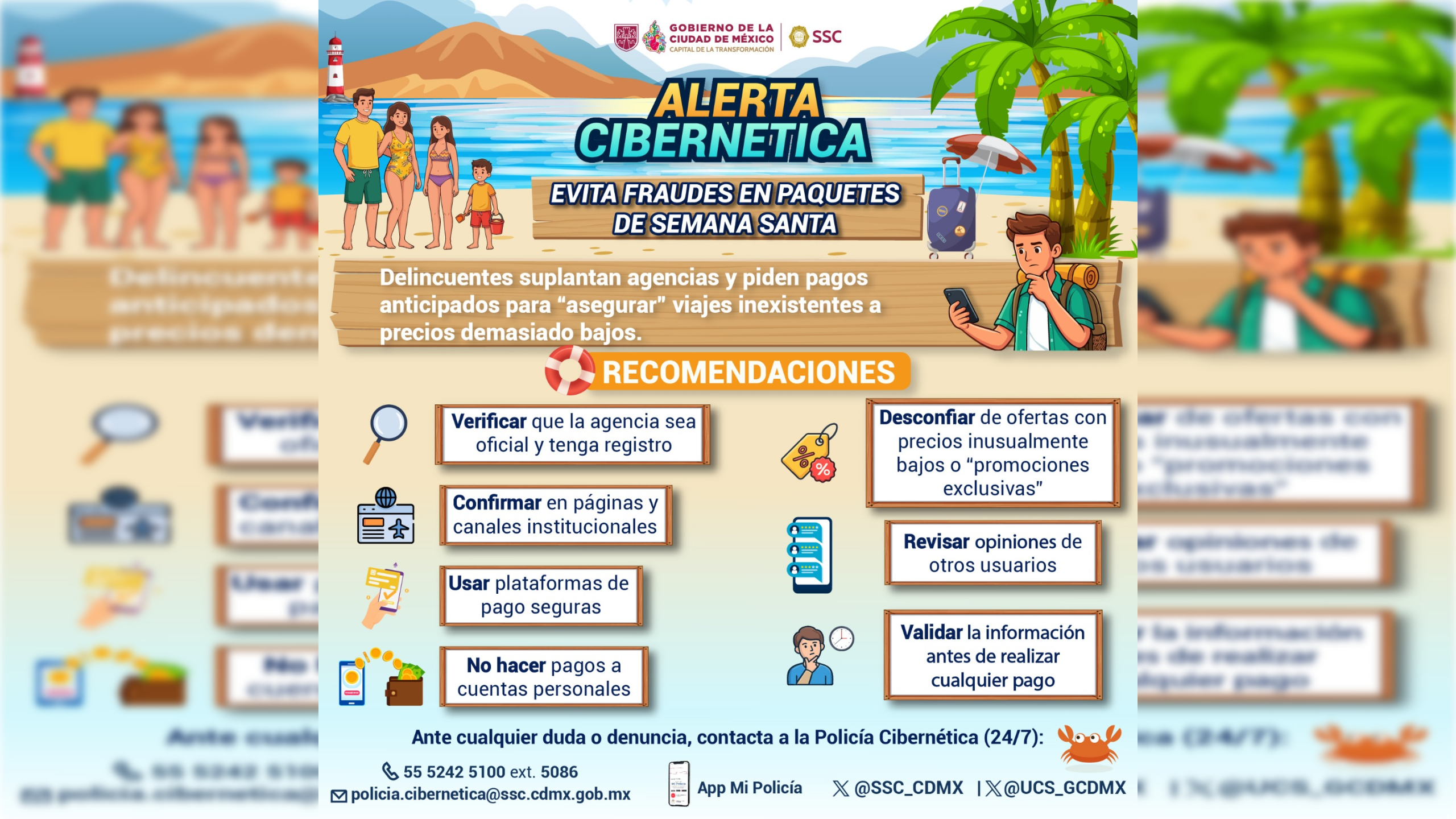 CIUDAD DE MÉXICO 26 DE MARZO (CDMX MAGACIN).- La Unidad de la Policía Cibernética, de la Secretaría de Seguridad Ciudadana (SSC) alertó sobre los fraudes en la venta de paquetes de viaje anunciados en el ciberespacio, que perjudican a personas interesadas en ofertas y promociones de temporada de Semana Santa.