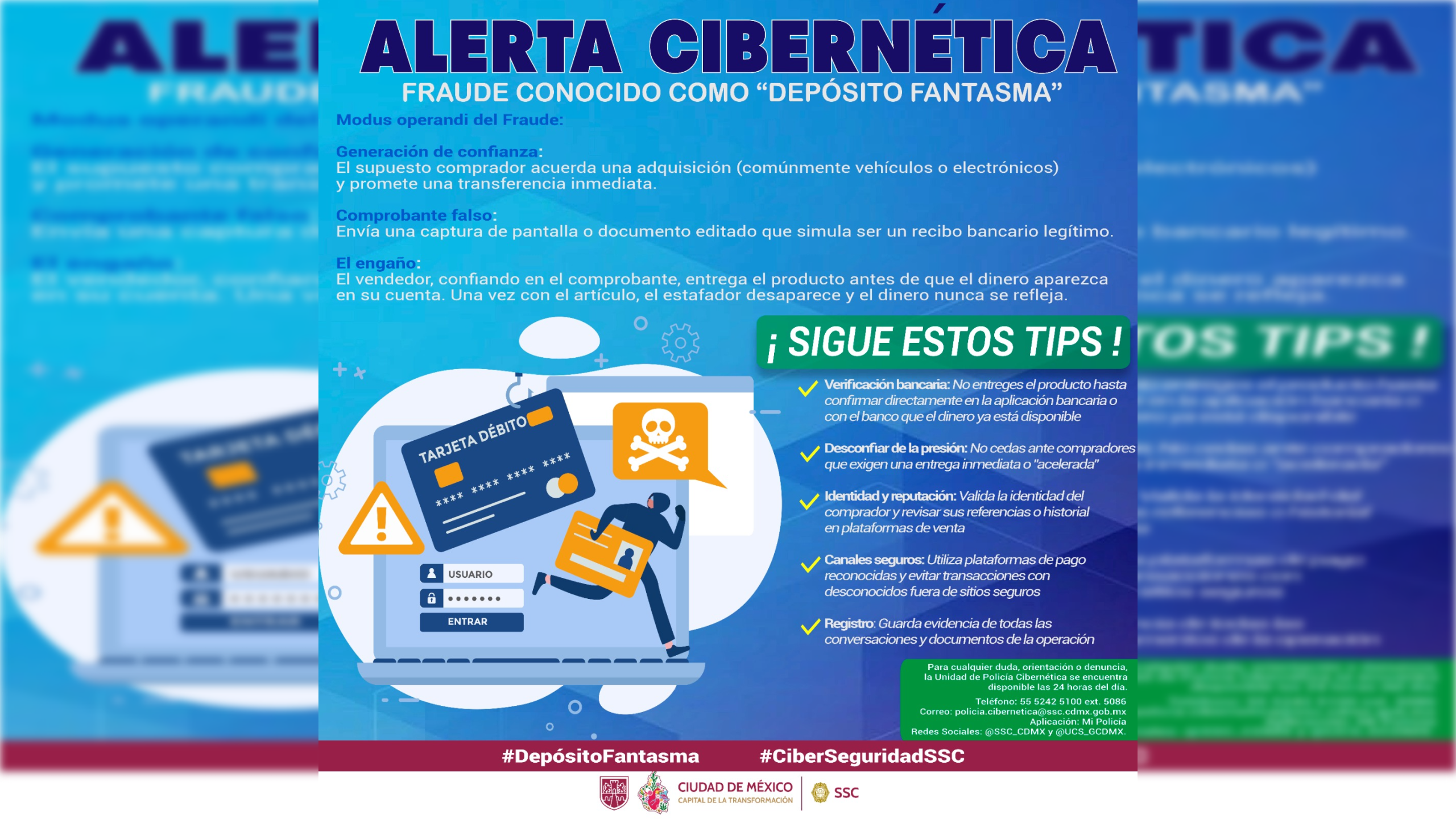 CIUDAD  DE MÈXICO 13 DE ENERO (CDMX MAGACIN).- La Policía Cibernética, alertó a la población sobre una modalidad de fraude conocido “Depósito Fantasma”.