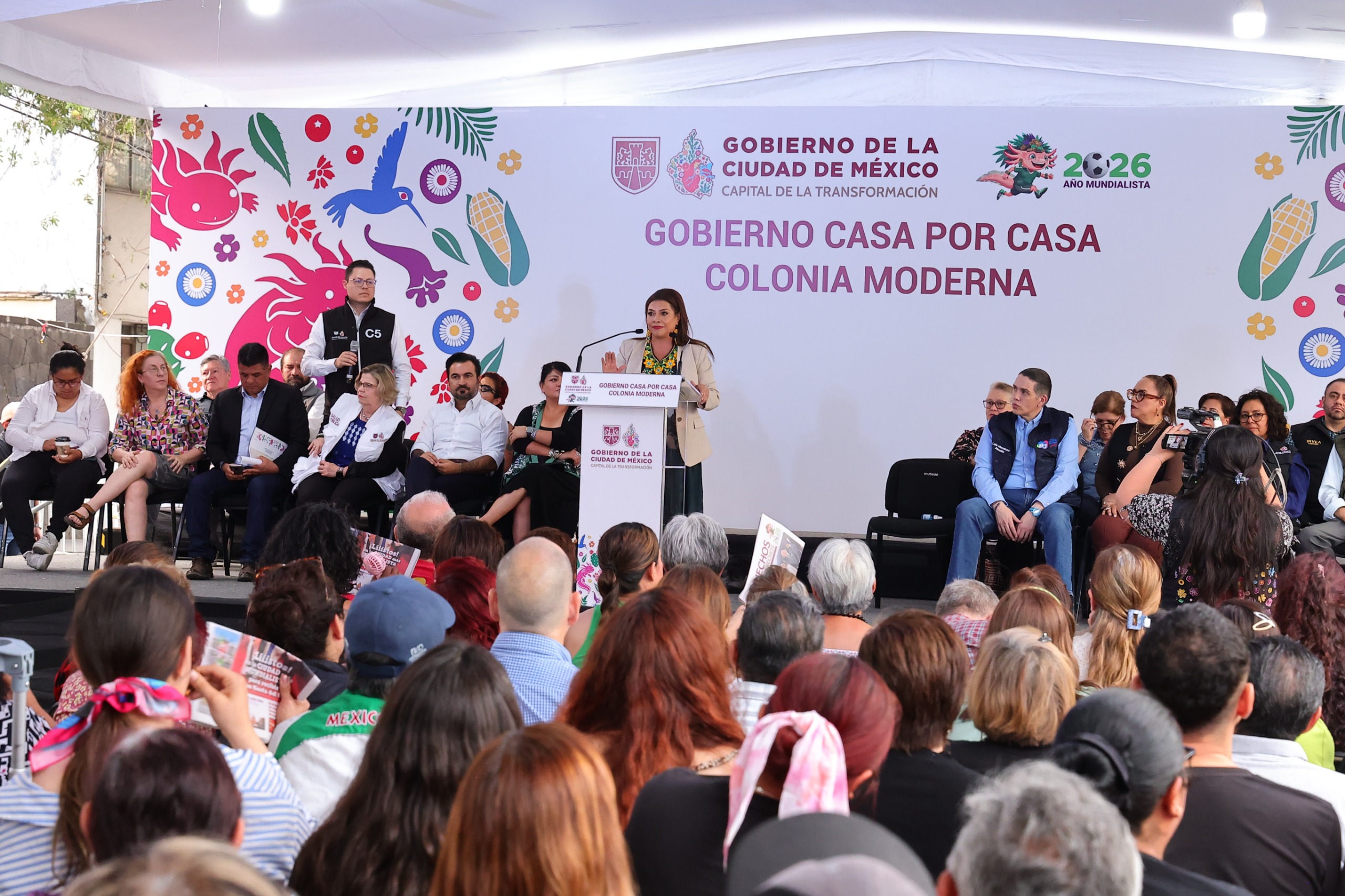 La secretaria de Salud, Nadine Gasman, destacó que en la colonia Moderna se implementa una jornada integral de servicios que prioriza la prevención y el acceso a la salud. Subrayó el reforzamiento de la vacunación contra el sarampión, con el objetivo de garantizar que niños cuenten con su esquema completo, así como ampliar la cobertura en población adulta.