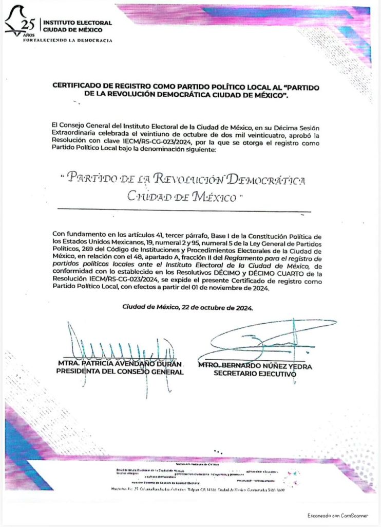 Como parte de los trámites, el 7 de octubre de 2024, en tiempo y forma, Nora Arias cumplió todos los requisitos solicitados por el IECM, llamados “documentos básicos”, y por ello es que le concedieron el registro como partido político local. De ello fue notificada mediante el oficio IECM/DEAPyF/2098/2024, fechado el 24 de octubre, dirigido a: “Mtra. Nora del Carmen Bárbara Arias Contreras, Presidenta de la Dirección Estatal Ejecutiva del otrora Partido de la Revolución Democrática en la Ciudad de México”. El dictamen “determina la procedencia del registro del partido político local denominado Partido de la Revolución Democrática Ciudad de México, de clave IECM/RS-CG-23/2024, aprobado en la Décima Sesión Extraordinaria de fecha veintiuno de octubre de dos mil veinticuatro, en particular, al punto DÉCIMO CUARTO”.