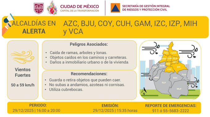 Lo anterior, debido al pronóstico de vientos con rachas fuertes para la tarde y noche de este lunes en Alcaldías: Azcapotzalco, Benito Juárez, Coyoacán, Cuauhtémoc, GAM, Iztacalco, Iztapalapa, Miguel Hidalgo y Venustiano Carranza.