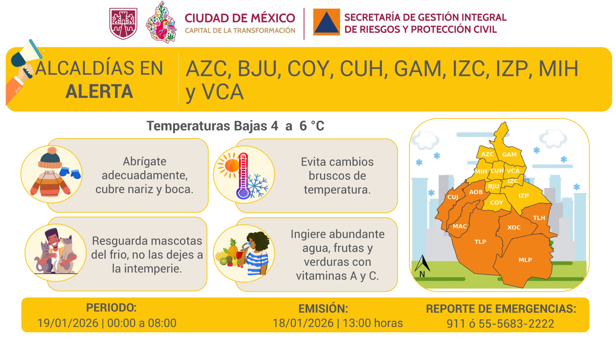 CIUDAD DE MÈXICO 18 DE ENERO (CDMX MAGACIN).- La Secretaría de Gestión Integral de Riesgos y Protección Civil informa que se activa Alerta Naranja por pronóstico de temperaturas bajas para las primeras horas de mañana en las demarcaciones: Álvaro Obregón, Cuajimalpa, Magdalena Contreras, Milpa Alta, Tláhuac, Tlalpan y Xochimilco.