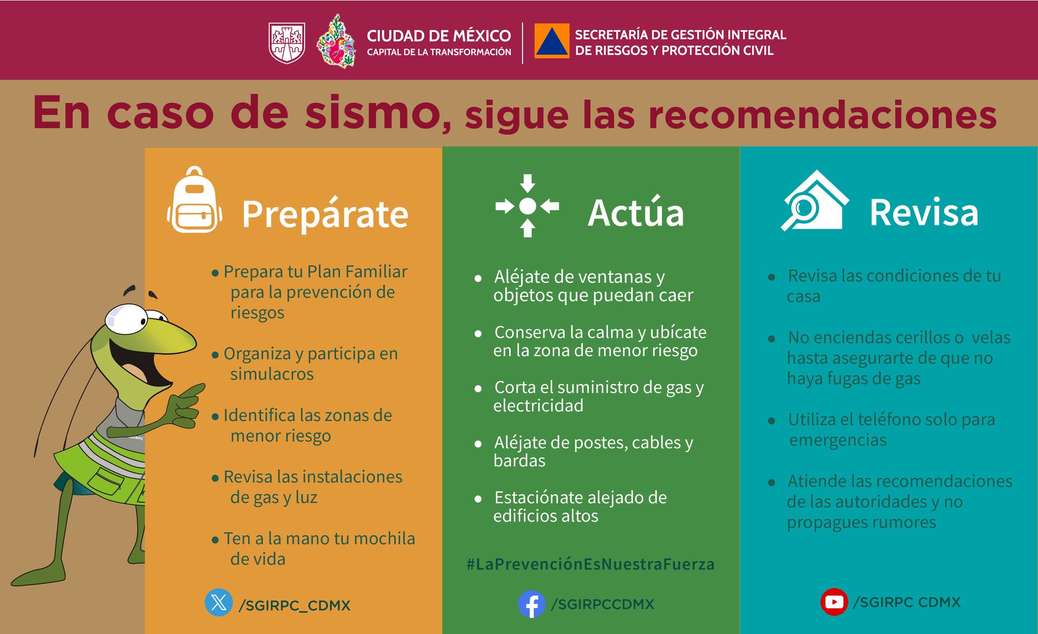 CIUDAD DE MÈXICO 16 DE ENERO (CDMX MAGACIN).- La Secretaria de Protección Civil emitió recomendaciones para saber qué hacer antes, durante y después de un sismo.