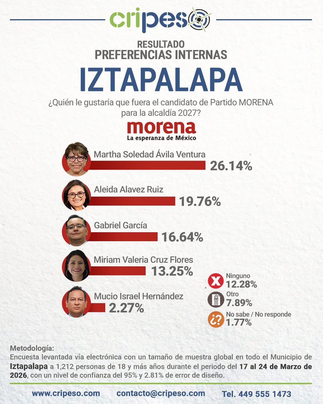 Lo anterior, luego de Cripeso Servicios de Consultoría efectuó un sondeo de opinión entre militantes y simpatizantes de MORENA para la elección interna de dicho instituto político durante el mes de marzo.