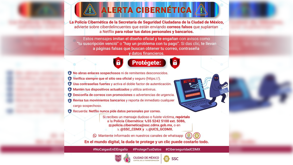 CIUDAD DE MÈXICO 10 DE ENERO (CDMX MAGACIN).- La Polcia Cibernetica alertó acerca del envío de correos electrónicos que suplantan la identidad de la plataforma “Netflix”.