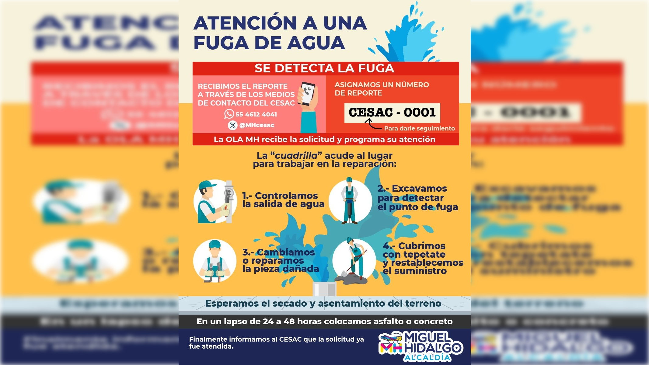 En redes sociales, explicaron al detectarse una fuga, el reporte es recibido a través de los medios de contacto del Cesac de la Alcaldía, acto seguido se asigna un numero de reporte y la solicitud es programada para ser atendida.