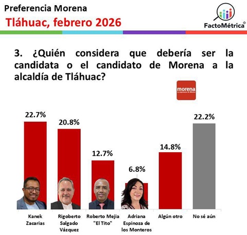 En Tláhuac, empieza a debilitarse el caciquismo del grupo político de la familia Salgado, y a abrirse el abanico hacia la selección de la candidata o candidato de Morena a la Alcaldía. Una encuesta elaborada por la empresa demoscópica FactoMétrica los últimos días de febrero, arrojó que el cacique en jefe, Rigoberto Salgado ya no tiene la mayoría de las preferencias en su partido. A la pregunta ¿quién considera que debería ser la candidata o el candidato de Morena a la Alcaldía Tláhuac?, el ganador fue Kanek Zacarías. Obtuvo el 22.7% de las preferencias, mientras que Salgado siguió perdiendo terreno y alcanzó 20.8%. En tercer lugar, Roberto Mejía, “El Tito”, con 12.7%. Y en un lejano cuarto lugar la diputada local Adriana Espinosa de los Monteros. Todavía faltan unos 5 meses para las definiciones, pero la tendencia hoy es que Kanek va creciendo y Salgado en descenso.