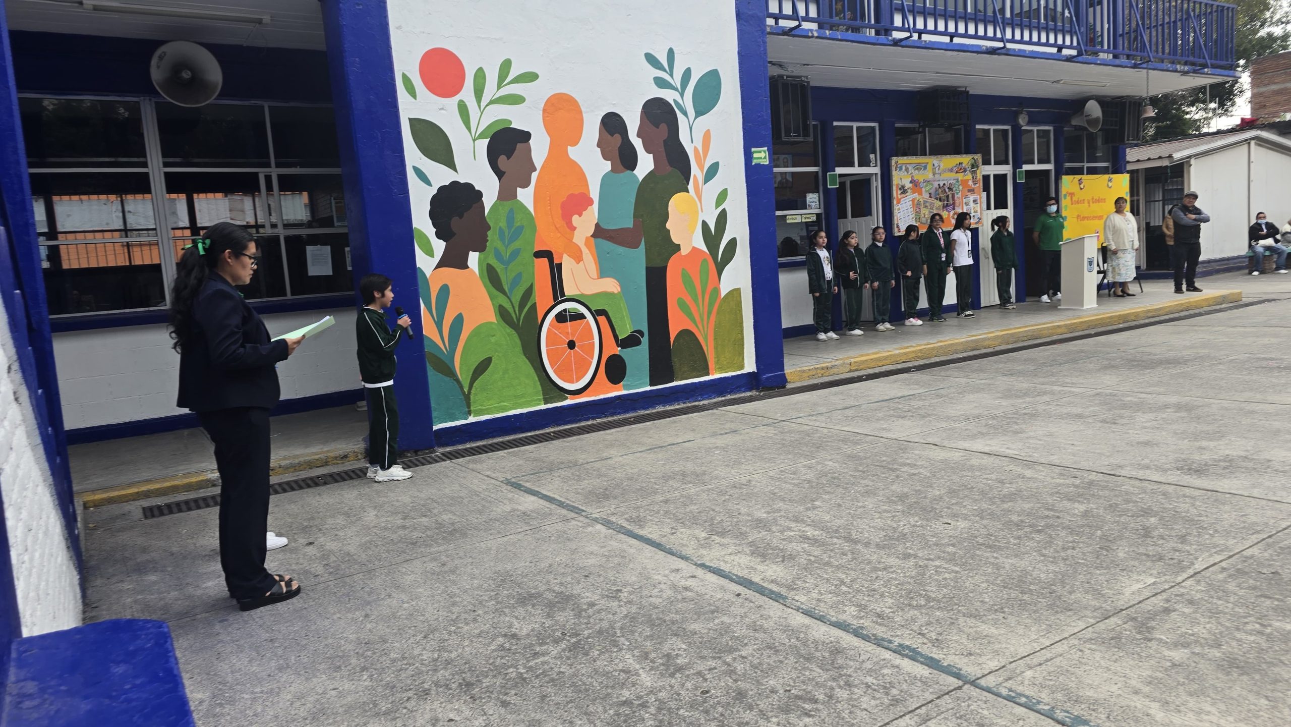 En el mural se aprecia a las personas conviviendo, rodeando a una niña en silla de ruedas. “Tener una obra de arte hermosa, sensible y alegre, logra que la primaria Dr. Samuel Ramos, sea mucho más que una simple escuela, la transforma en un lugar donde los estudiantes aprenden, conviven, sonríen, pero, ante todo, ven la vida en la representación perfecta de apoyo, comprensión, aceptación, esa que les invita a sentirse seguros, valorados y escuchados”, dijo la Maestra Especialista Adriana Tenorio Muñoz Cota.