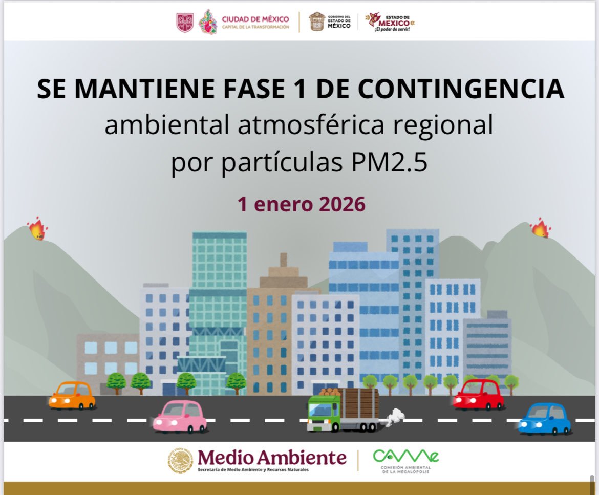CIUDAD DE MÈXICO 01 DE ENERO (CDMX MAGACIN).- La Comisión Ambiental de la Megalópolis (CAMe) informa que se mantiene la Fase I de contingencia ambiental atmosférica regional por partículas PM2.5 y sus medidas para la zona Sureste del Valle de México, con el fin de proteger la salud de la población ante la exposición a niveles altos de contaminación.