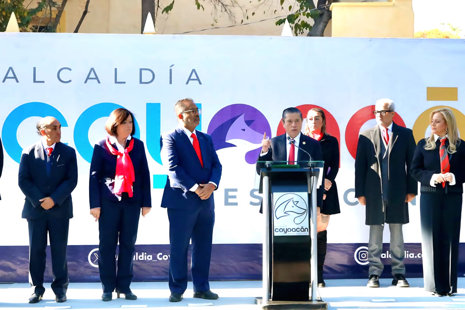 CIUDAD DE MÉXICO 24 DE FEBRERO (CDMX MAGACIN).-Al encabezar la ceremonia conmemorativa por el Día de la Bandera, el alcalde de Coyoacán, Giovani Gutiérrez Aguilar, reafirmó su compromiso con México y destacó que, desde esta demarcación, “tierra mundialista, reconocida por su historia y sus profundas raíces patrióticas, se ratifica el compromiso con la patria no sólo con discursos, sino con acciones concretas que transforman el entorno”.