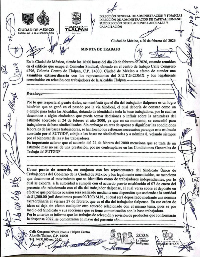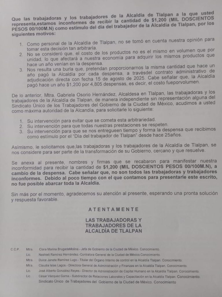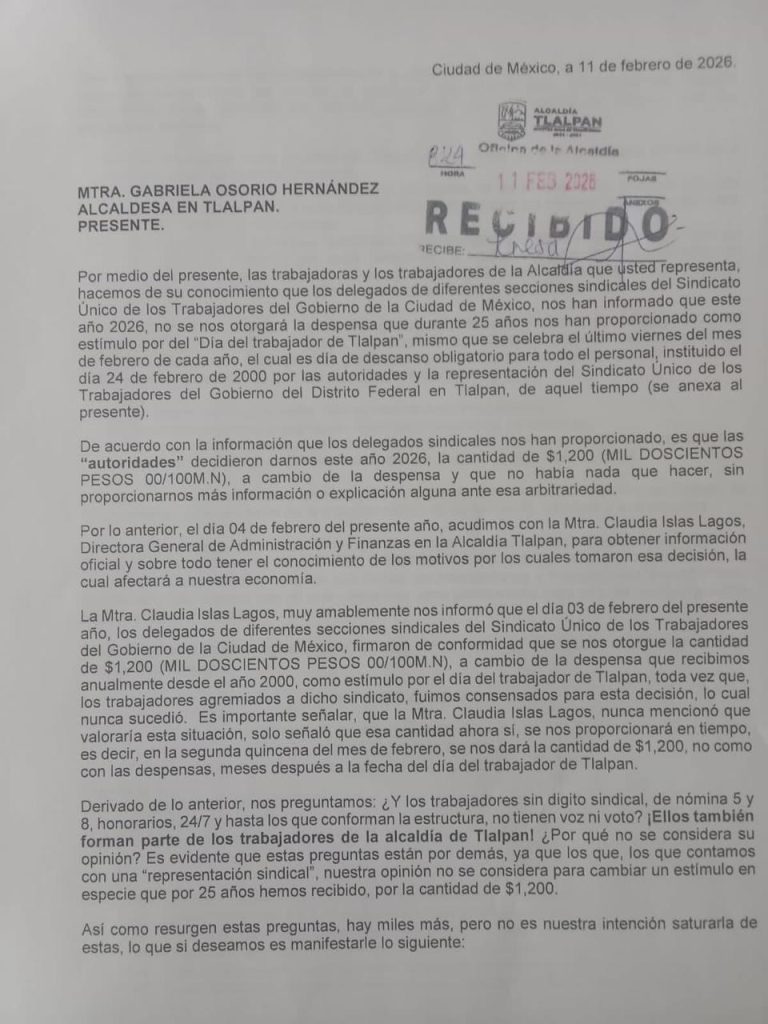 Otra vez, trabajadores de la Alcaldía Tlalpan acusaron a la edil de Morena, Gabriela Osorio de robarles dinero. En poder de esta columna hay información documental en la que se advierte que son más de 4 mil trabajadores de la demarcación que han resultado afectados en sus ingresos, pues igual que al inicio del año anterior, les han retenido pagos. Denuncian que la alcaldesa Osorio y su Gabinete “actuaron de una forma ilegal y traicionera, en contubernio con el Sindicato de Trabajadores de la Ciudad de México”, contra los derechos de la base trabajadora, pues acordaron “en lo oscurito” que no se les diera la despensa, la que se otorga como incentivo a la plantilla laboral de Tlalpan, desde el año 2000, por decreto de la entonces jefa de Gobierno, Rosario Robles Berlanga. Los autonombrados líderes sindicales, nos cuentan trabajadores, se presentaron con la alcaldesa y su Gabinete para acordar que, en lugar de dar la despensa a más de 4 mil trabajadores, este año sólo se les darían mil 200 pesos en febrero, en efectivo, a pesar de que el valor de la despensa es de mil 700 pesos. O sea, andan ausentes 2 millones de pesos, y ni la directora general de Administración, Claudia Islas, y menos Osorio le dan la cara a los trabajadores.